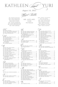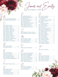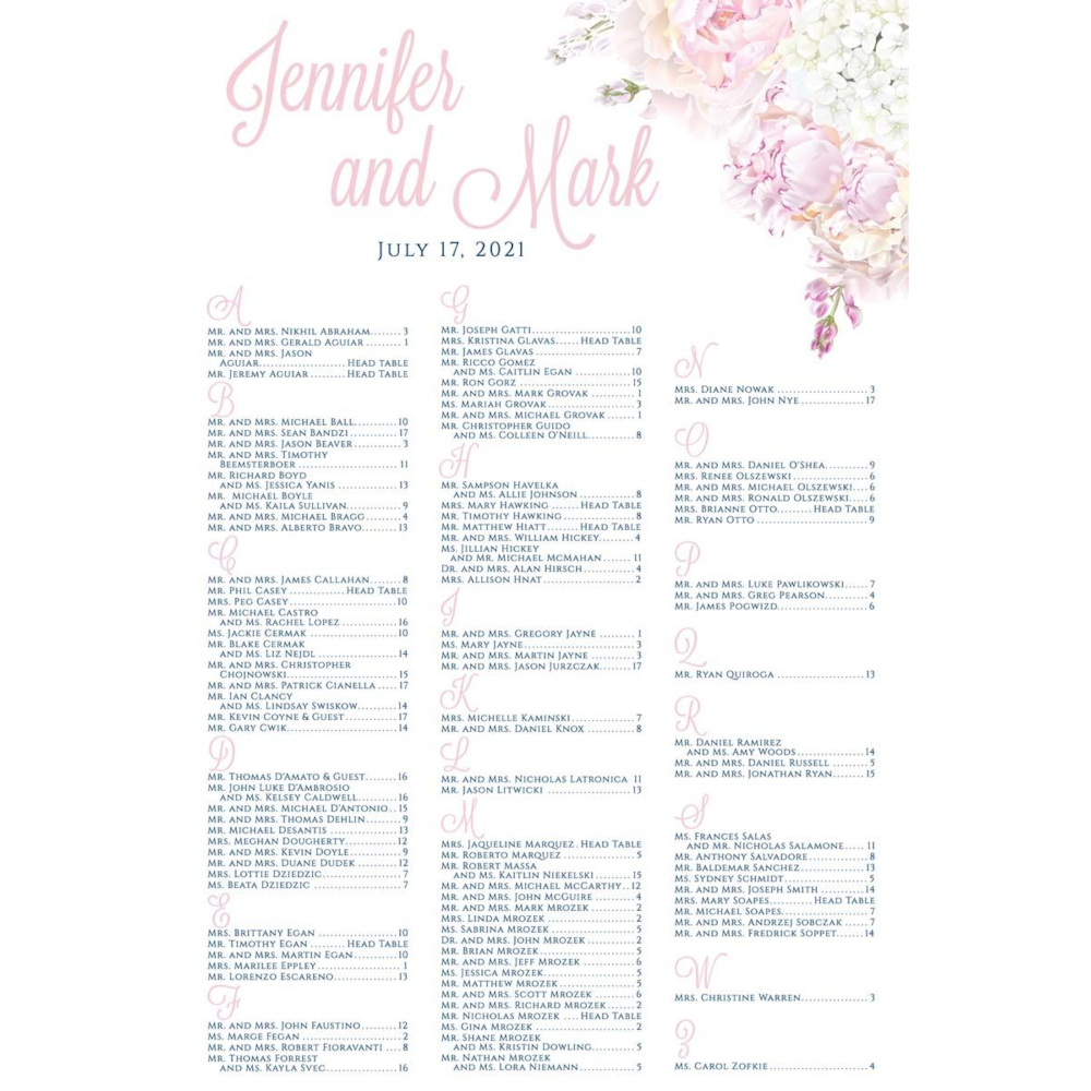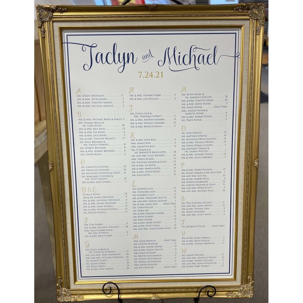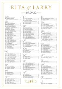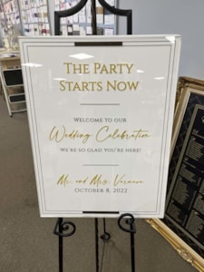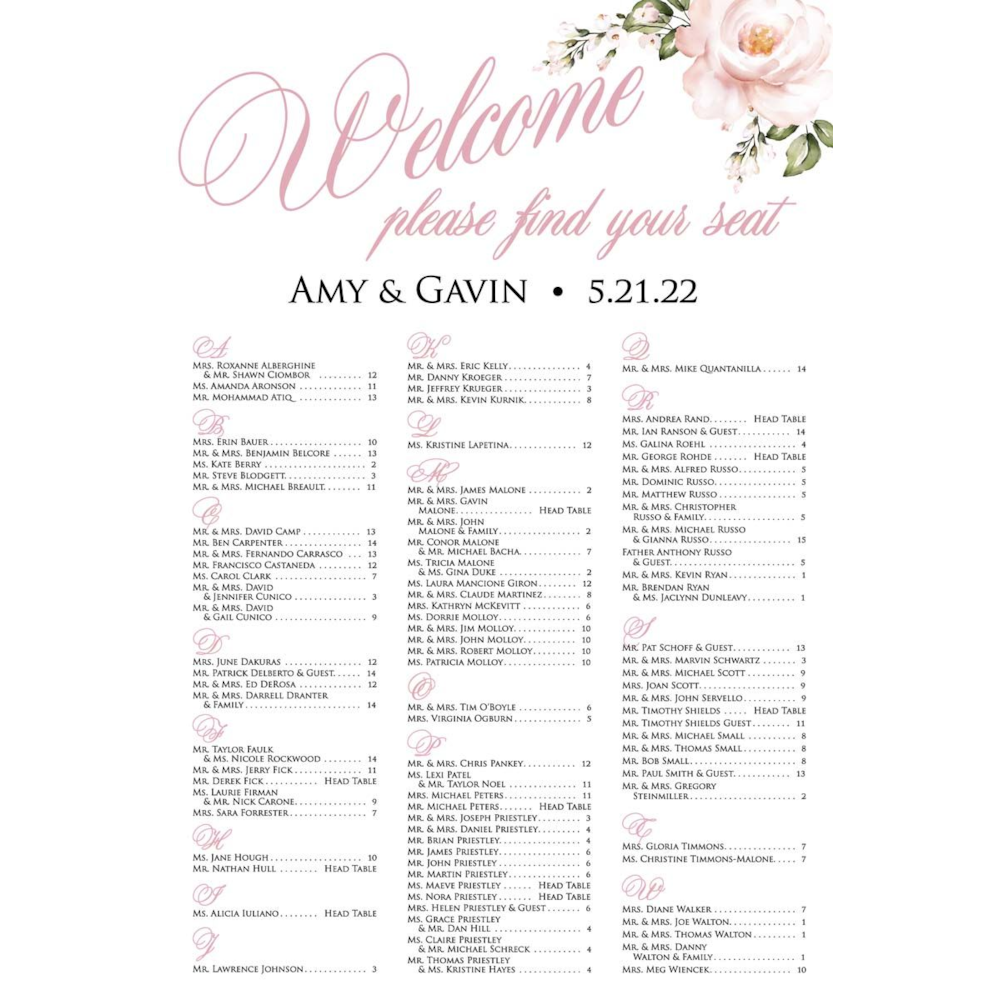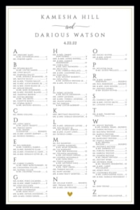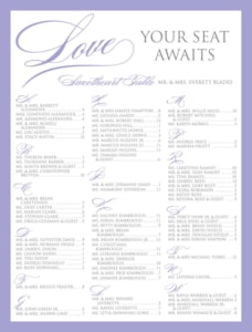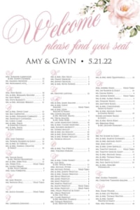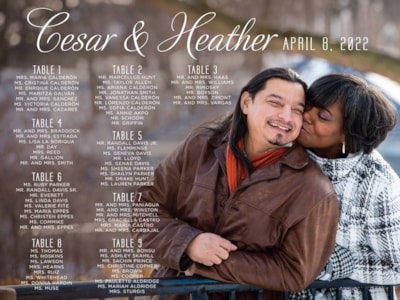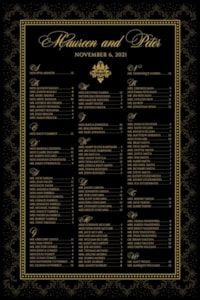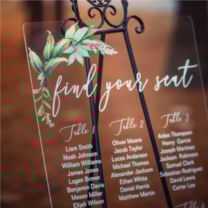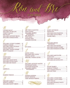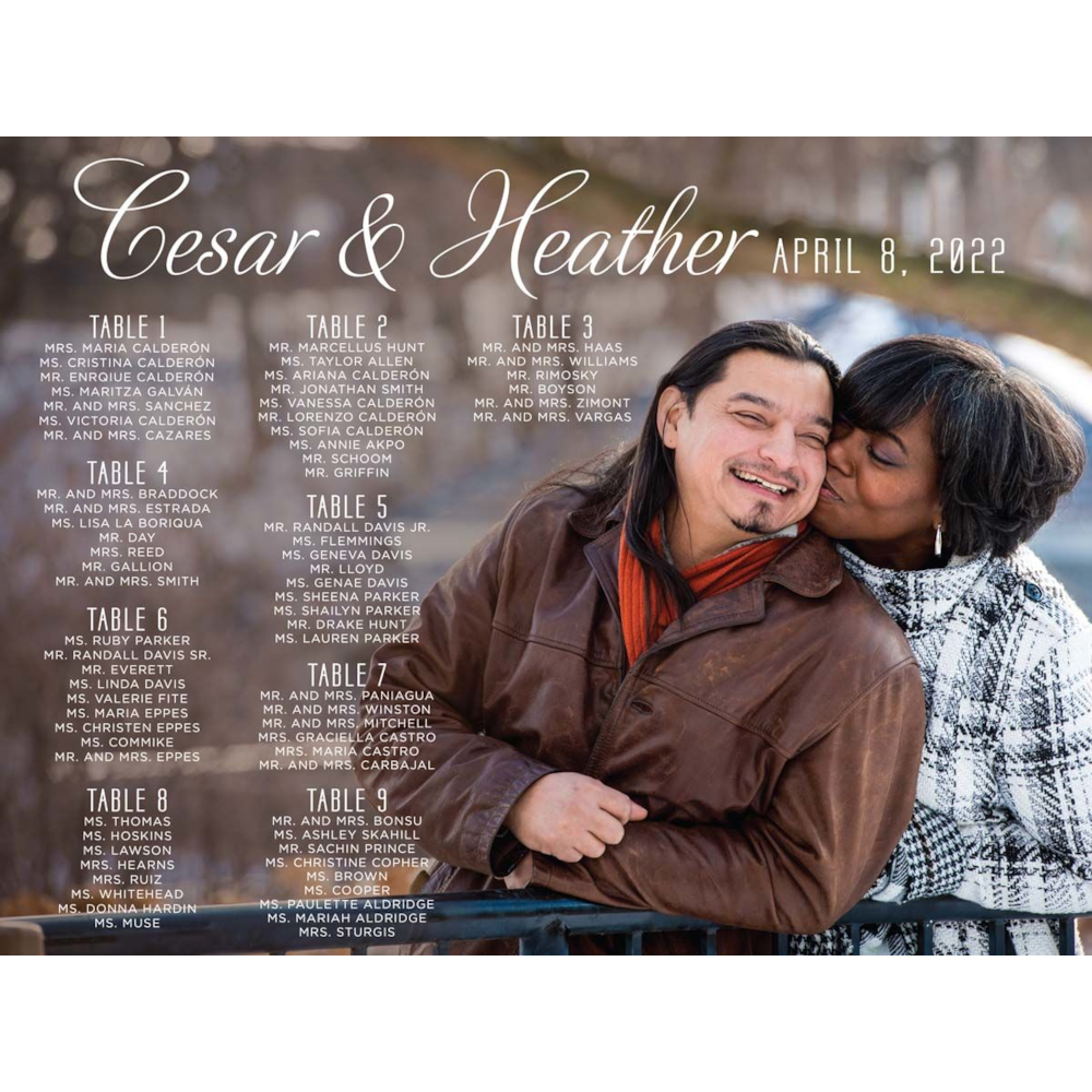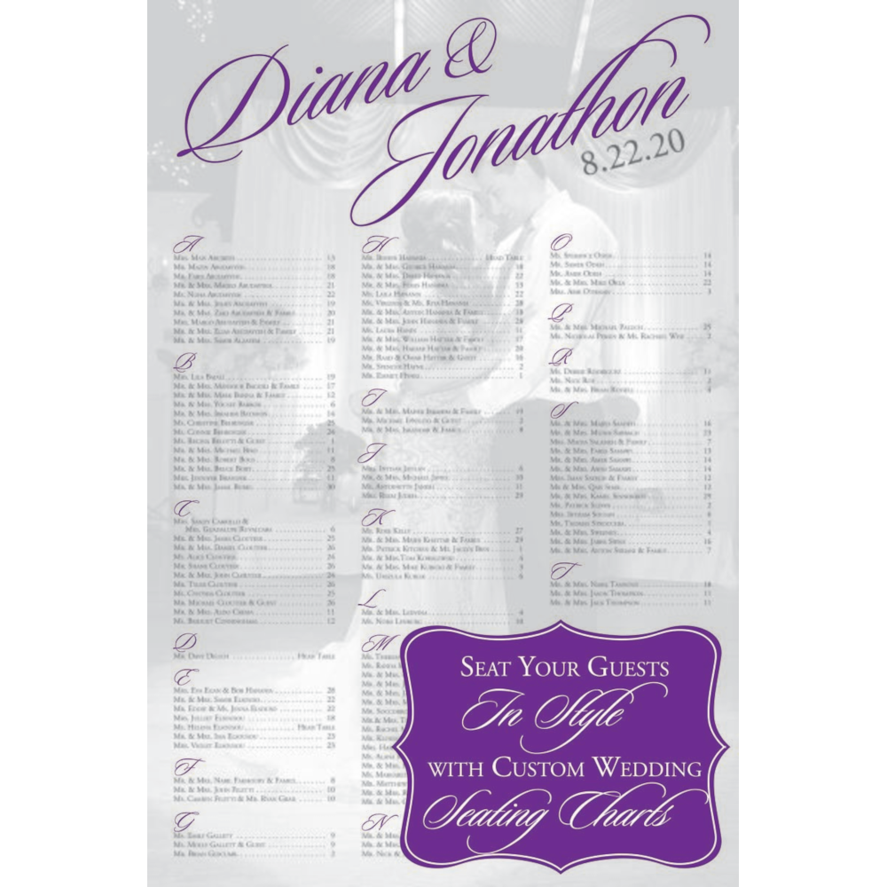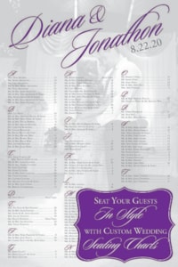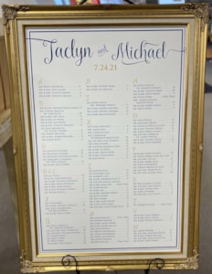 Our customizable seating charts allow you to incorporate your wedding theme, colors, and personal flair. Whether you prefer a traditional elegant design or a modern, minimalist approach, our design team can create a chart that complements your overall décor and enhances the visual appeal of your venue. We can print on foamcore, paper or acrylic depending on your overall design.