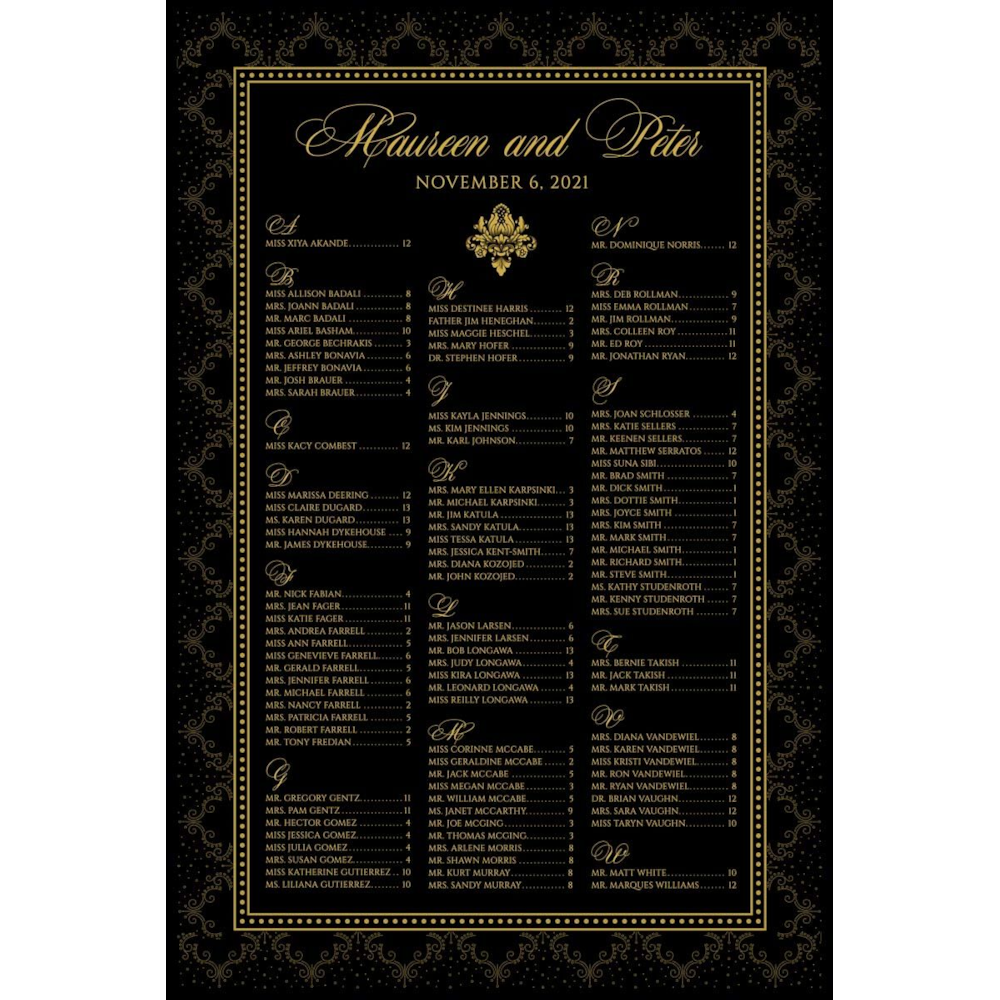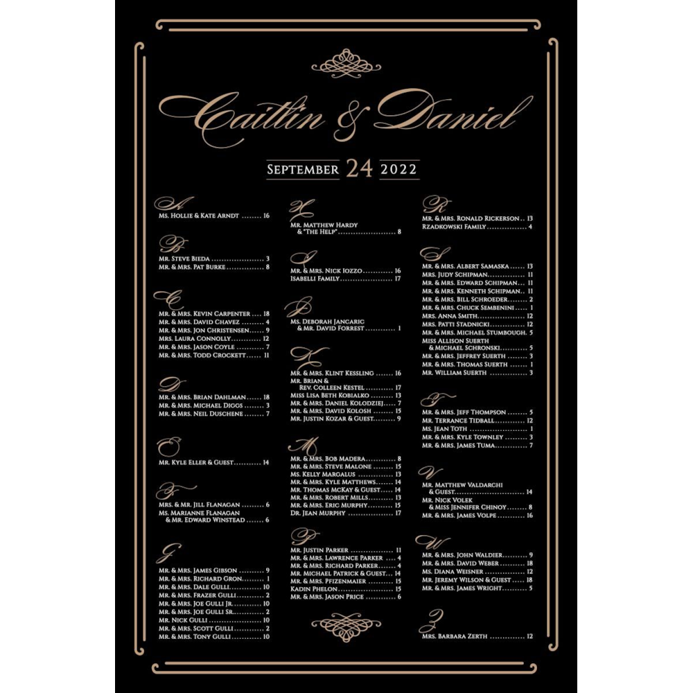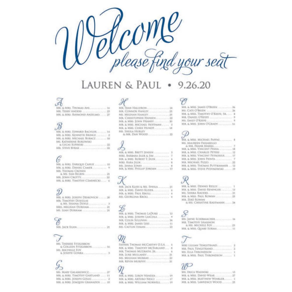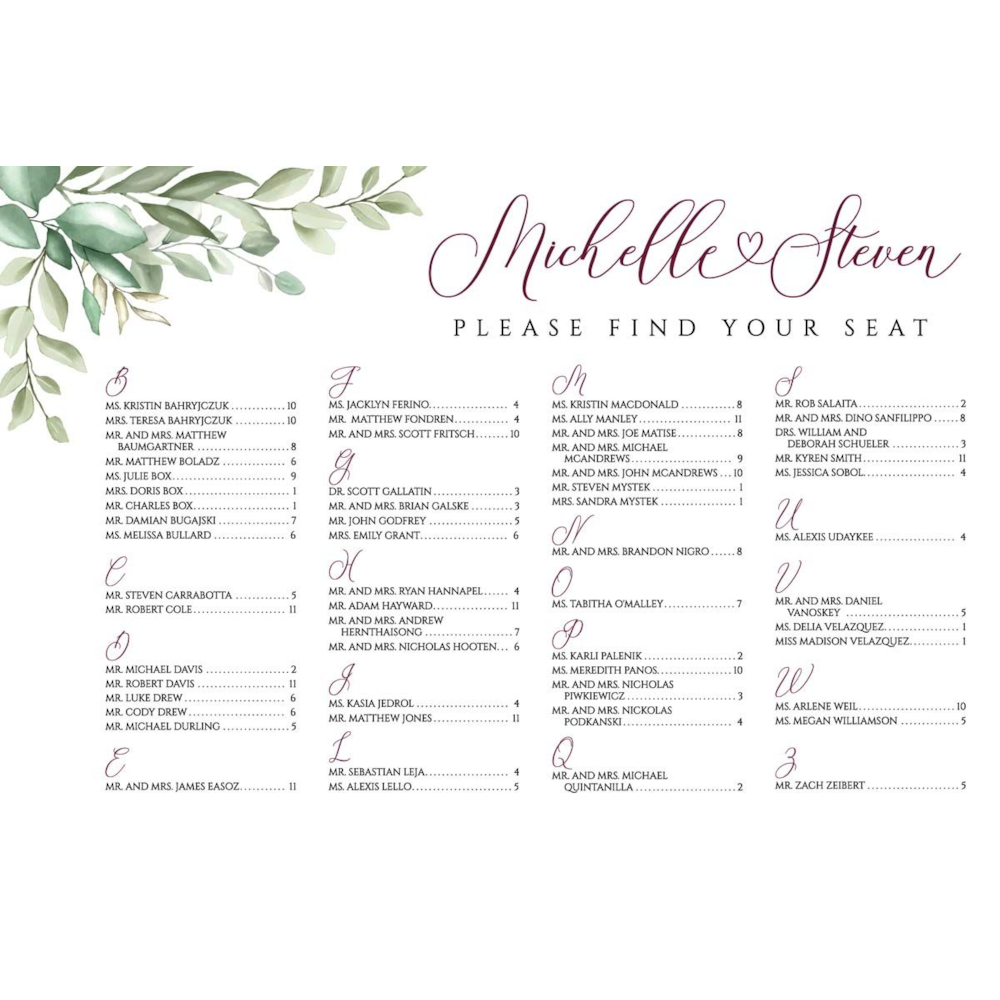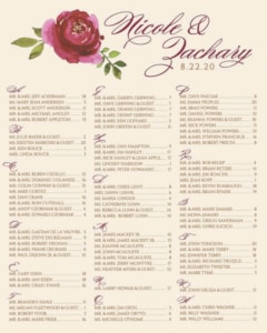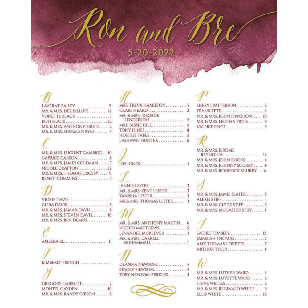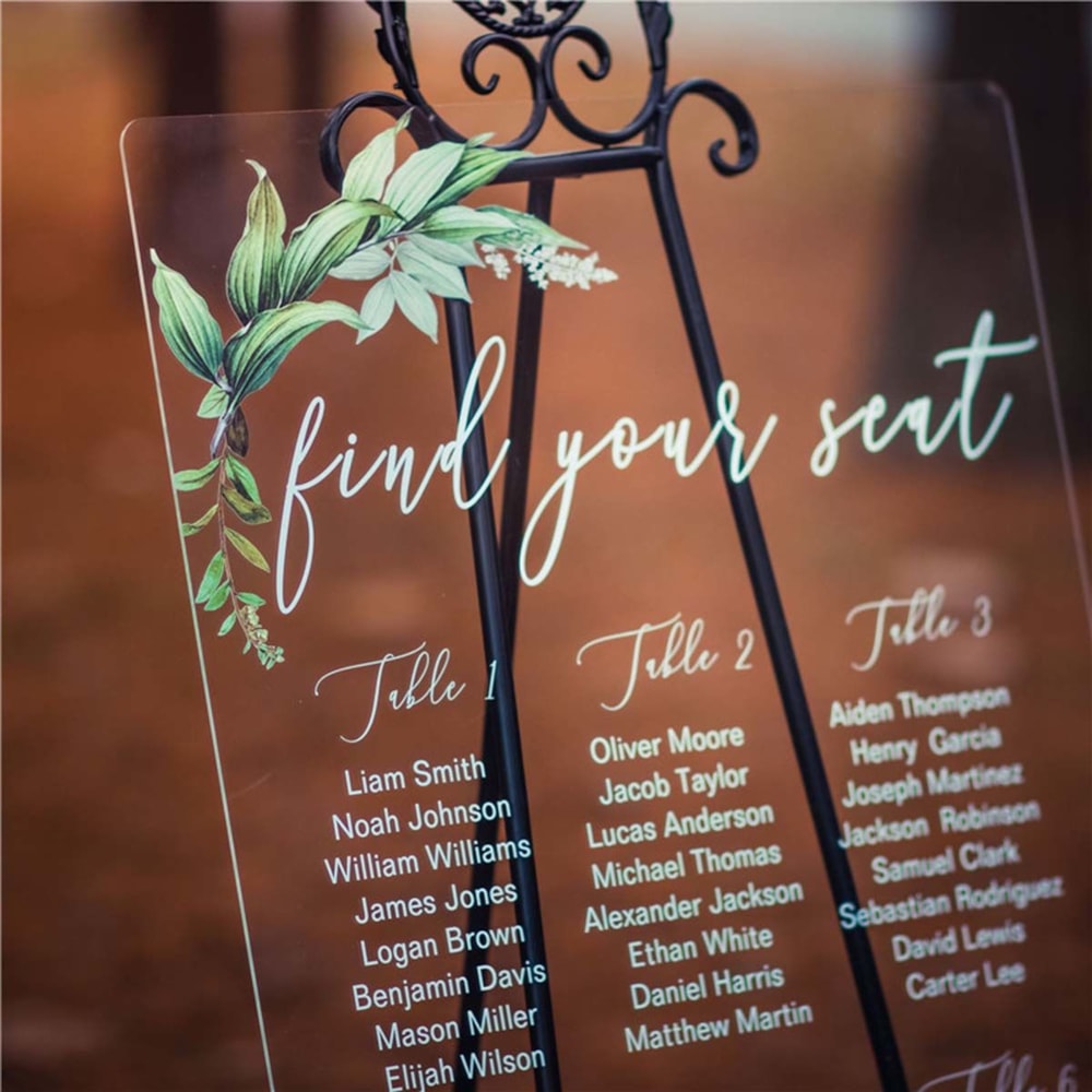 Our customizable seating charts allow you to incorporate your wedding theme, colors, and personal flair. Whether you prefer a traditional elegant design or a modern, minimalist approach, our design team can create a chart that complements your overall décor and enhances the visual appeal of your venue. We can print on foamcore, paper or acrylic depending on your overall design.