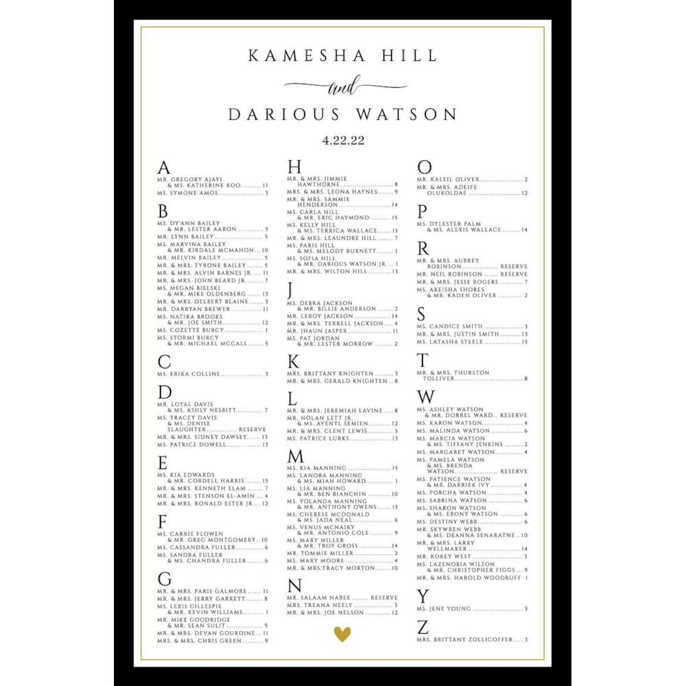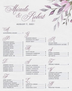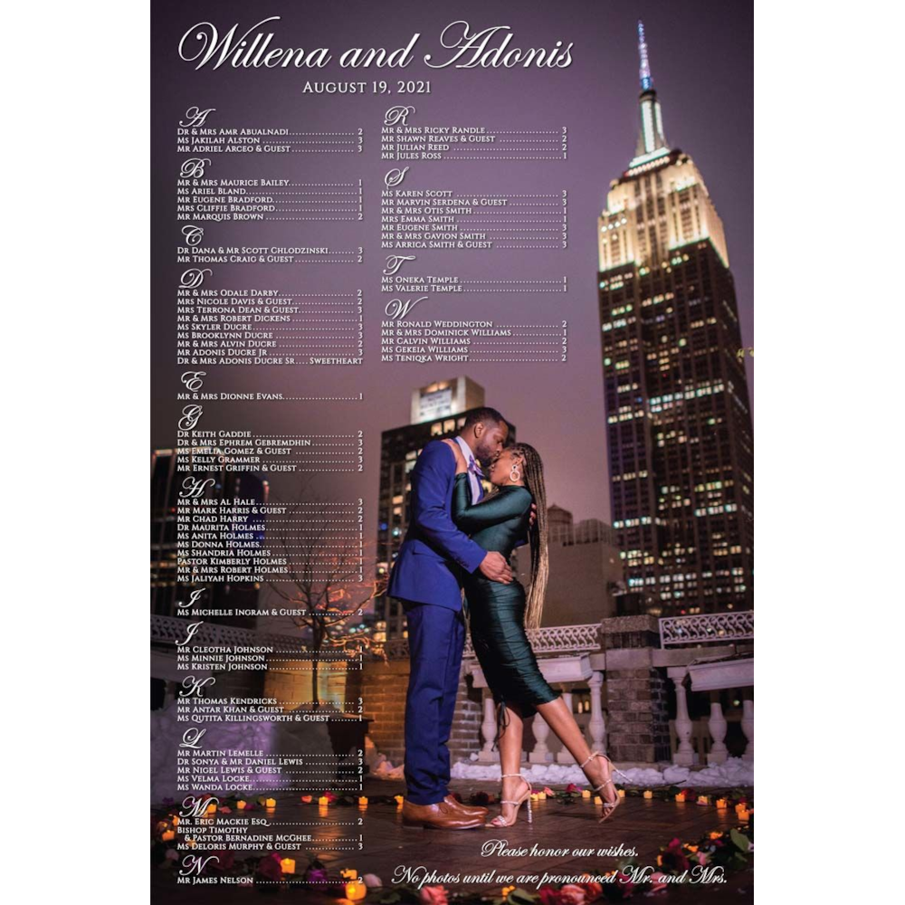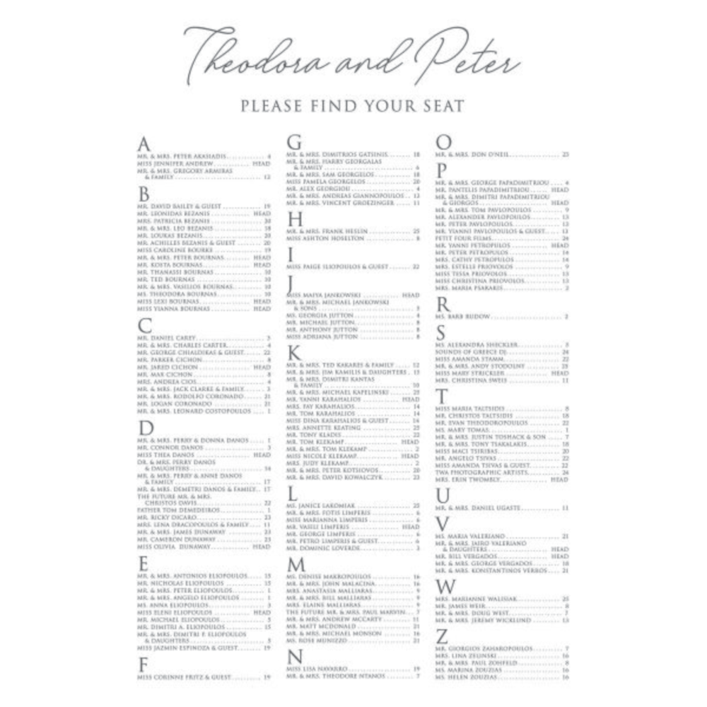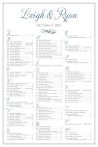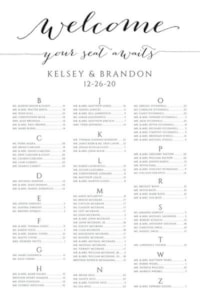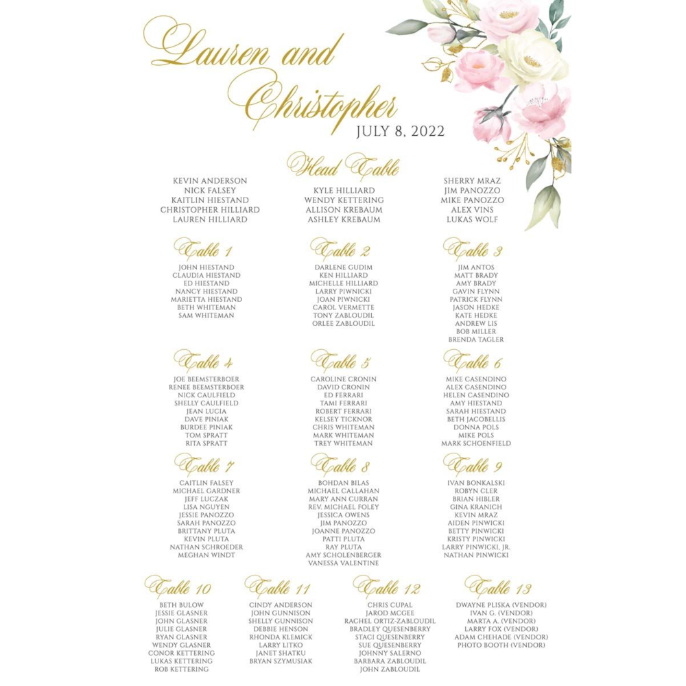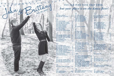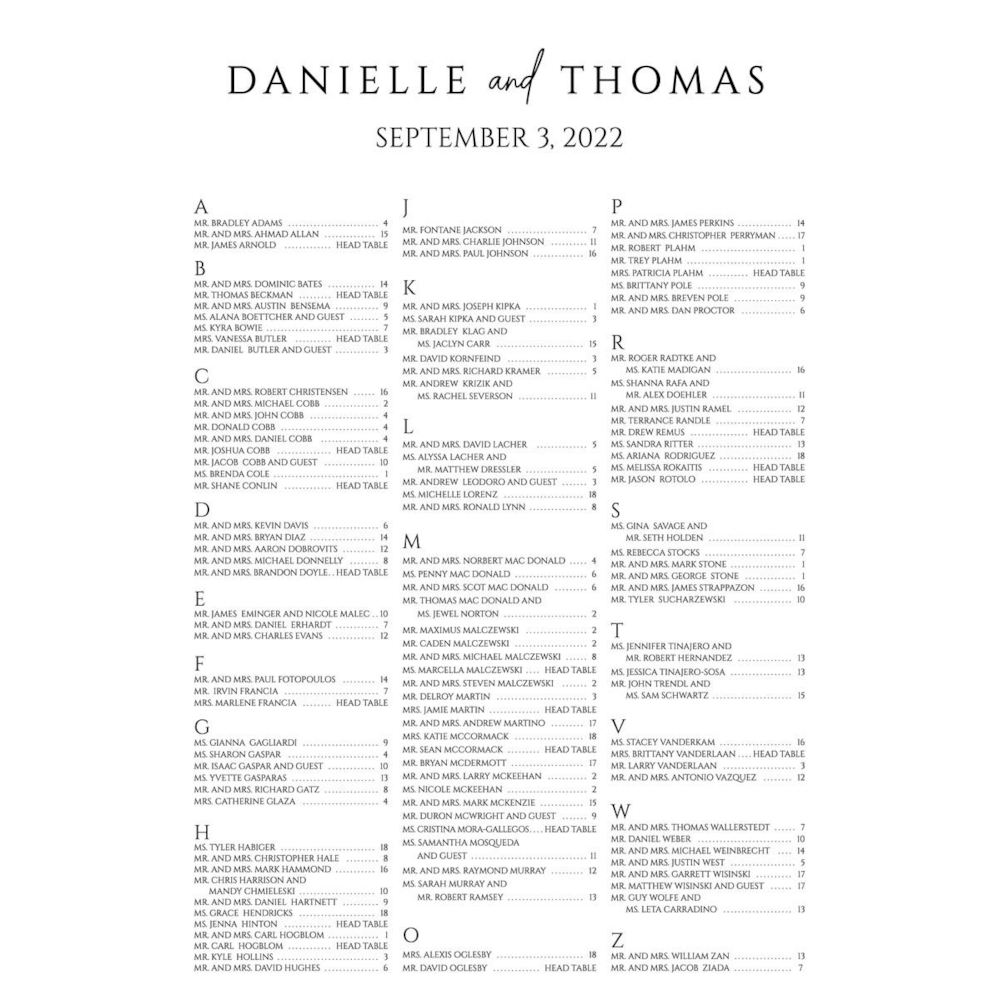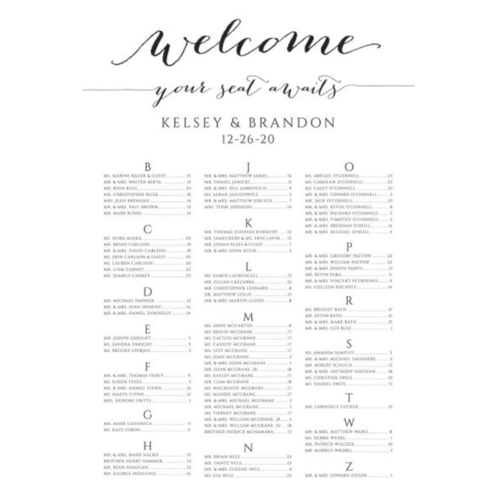 Our customizable seating charts allow you to incorporate your wedding theme, colors, and personal flair. Whether you prefer a traditional elegant design or a modern, minimalist approach, our design team can create a chart that complements your overall décor and enhances the visual appeal of your venue. We can print on foamcore, paper or acrylic depending on your overall design.